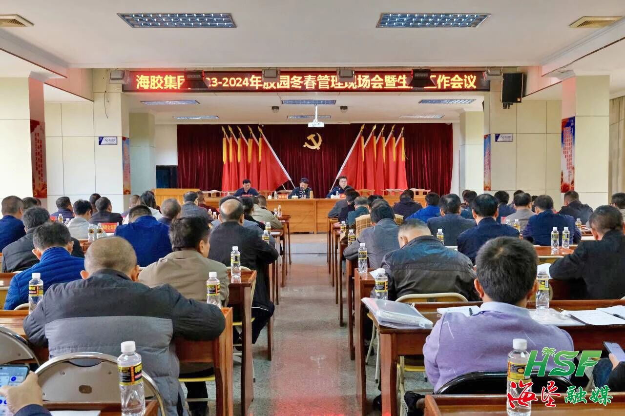 12月22日,海南橡膠2023-2024年膠園冬春管現(xiàn)場會暨生產(chǎn)工作會議在山榮分公司召開,海南橡膠黨委委員、副總經(jīng)理黃廉宏出席會議并作部署講話,總部相關負責人,以及25家基地分公司、種苗分公司總經(jīng)理、分管生產(chǎn)工作副總經(jīng)理及生產(chǎn)部長等共100余人參加會議。